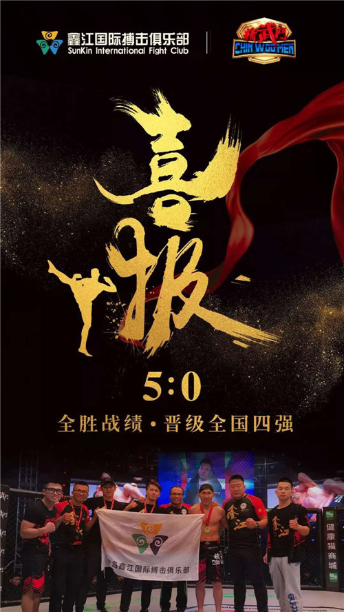 2018年4月15日,中國(guó)頂尖的MMA賽事,精武門綜合格斗職業(yè)聯(lián)賽(2017-2018賽季)團(tuán)體4強(qiáng)賽,在福建泉州市海峽體育中心震撼打響。鑫江搏擊,謝維、王碩、哈比提吐爾遜別克、付康康、巴拉金,以5:0 全勝戰(zhàn)績(jī),實(shí)力碾壓對(duì)手,挺進(jìn)全國(guó)四強(qiáng)。