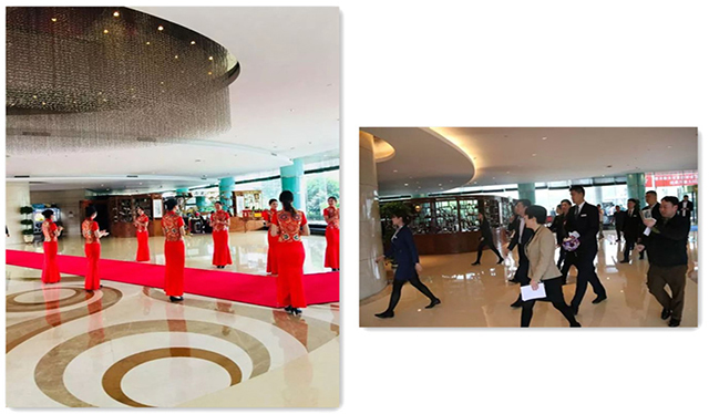 圖為酒店總經(jīng)理張曉東女士、副總經(jīng)理秦孟基、呂功濤先生及酒店管理層接待