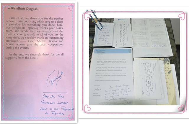 巴基斯坦總統(tǒng)馬姆努恩·侯賽因(Mr.Mamnoon Hussain)及貴賓一行對酒店的服務表示稱贊和滿意。峰會期間,酒店員工用心的服務收到了國內(nèi)外貴賓近40封表揚信,臨別之時,馬姆努恩·侯賽因總統(tǒng)更是贈送禮物,對酒店全體員工表示感謝。