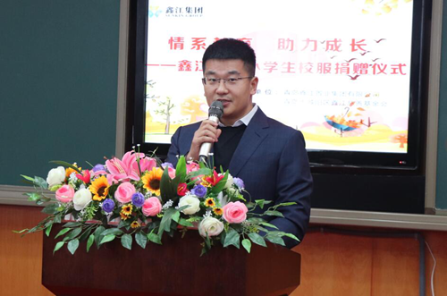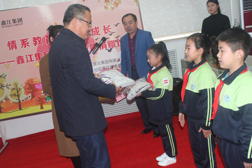 鑫江集團副總經(jīng)理趙文博先生向小學(xué)生送上校服