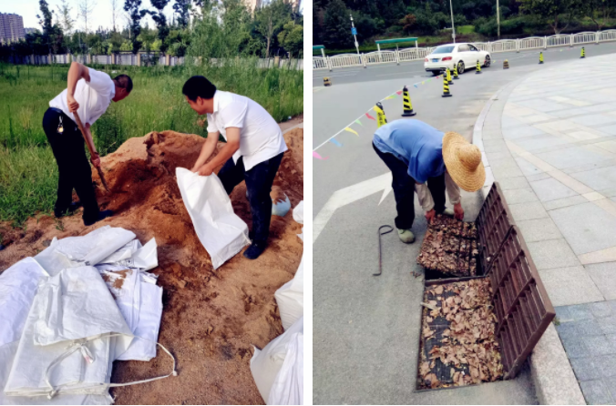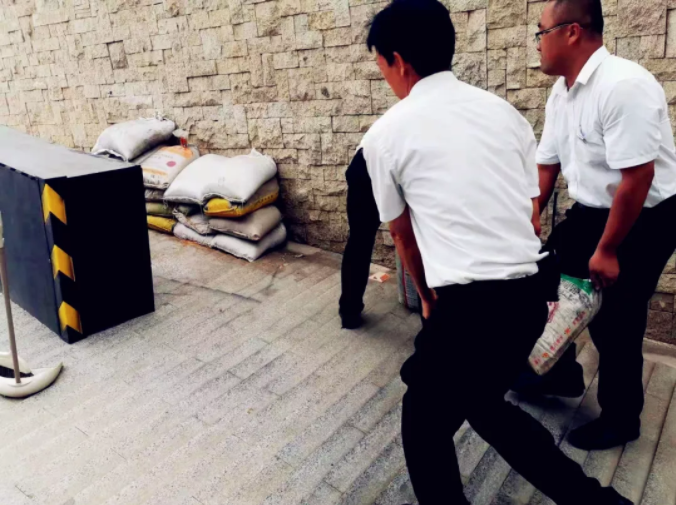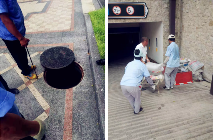 8月9日下午2點,安全檢查小組開始對排水系統(tǒng)、天溝等進行疏通,在地庫門口等關(guān)鍵位置放置防汛沙袋。