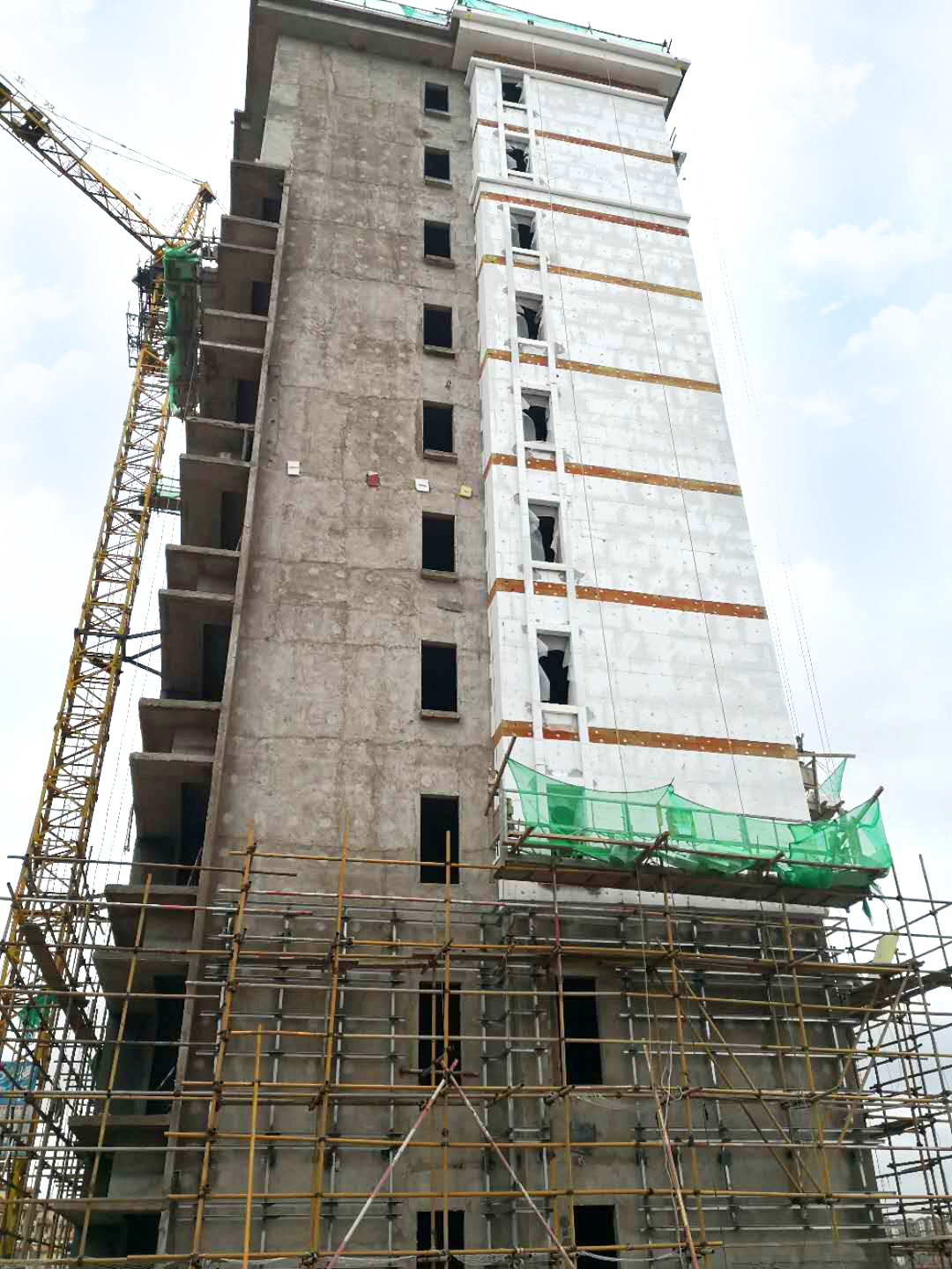 內(nèi)墻抹灰結(jié)束,外立面保溫、石材施工中