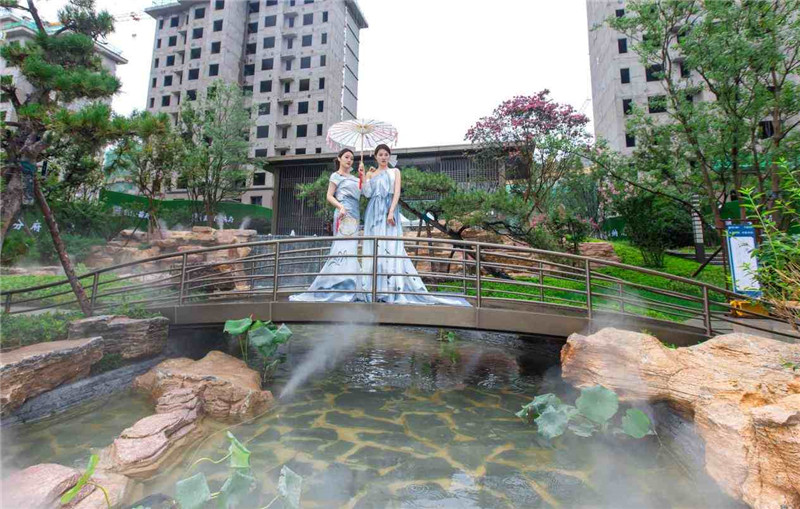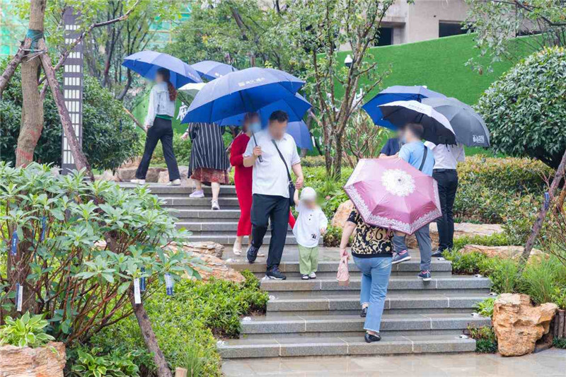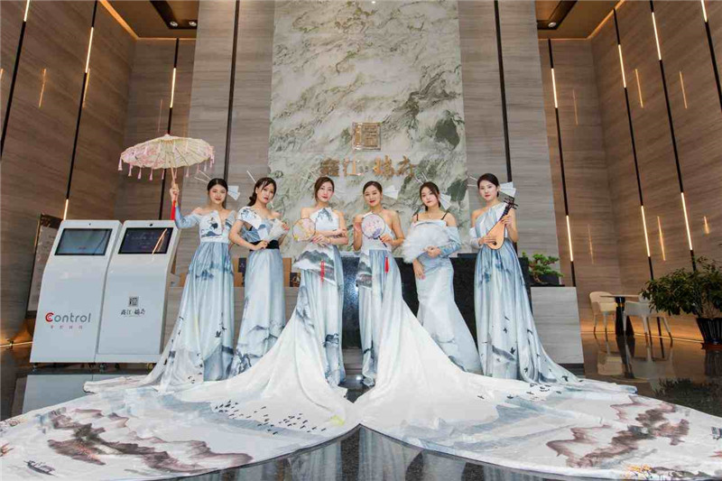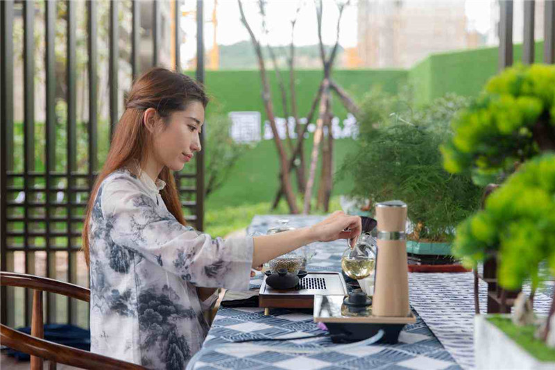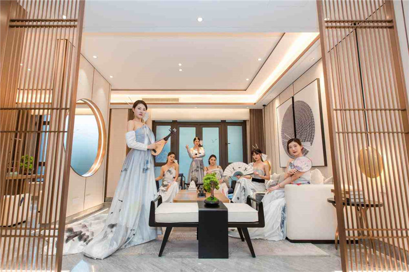 雨中的歆湖云霧繚繞,臥虹橋仿佛在訴說一段古老而美麗的故事。中式園林中,身著精美古裝的佳人仕女,曼妙若畫,在旖旎的禮樂中上演一曲醉人如夢,將示范區(qū)的東方之美和風華絕代淋漓盡致地展現(xiàn)于眼前。攬勝軒內(nèi),精心準備的茶藝表演讓在場嘉賓沉醉其中,品茗、賞景、談笑風生。