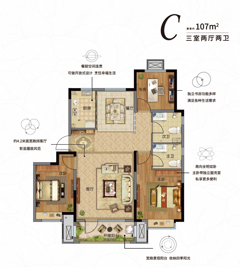 全明方正戶型,南北通透,瞰景寬綽陽臺,與家人一同共享四季景致的更替和全齡社區(qū)的活力。超尺度陽臺,除了晾曬、瞰景等常規(guī)功能外,多功能空間布局,匹配家庭每位成員的生活渴望。舒適主臥配備瞰景飄窗,締造生活儀式感;部分實(shí)景現(xiàn)房交付,即買即入住,幸福不必等待。