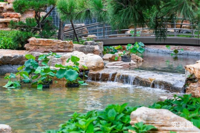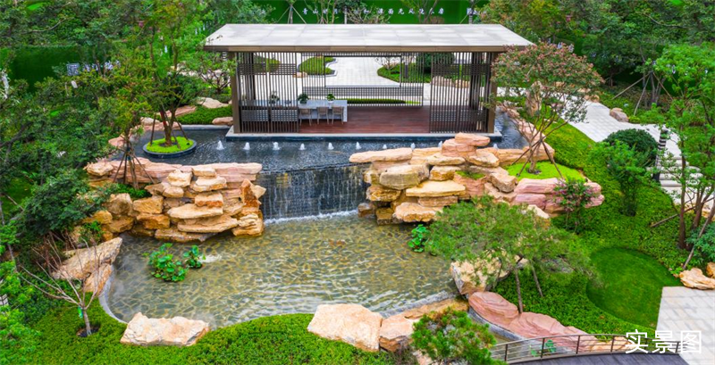 在《千里江山圖》中,蒼松掩映的疊瀑,在值此青綠間,尤為賞心悅目。而在鑫江·瑞府,也有這樣的疊瀑,自攬勝軒流下匯入歆湖,大氣而靈動。