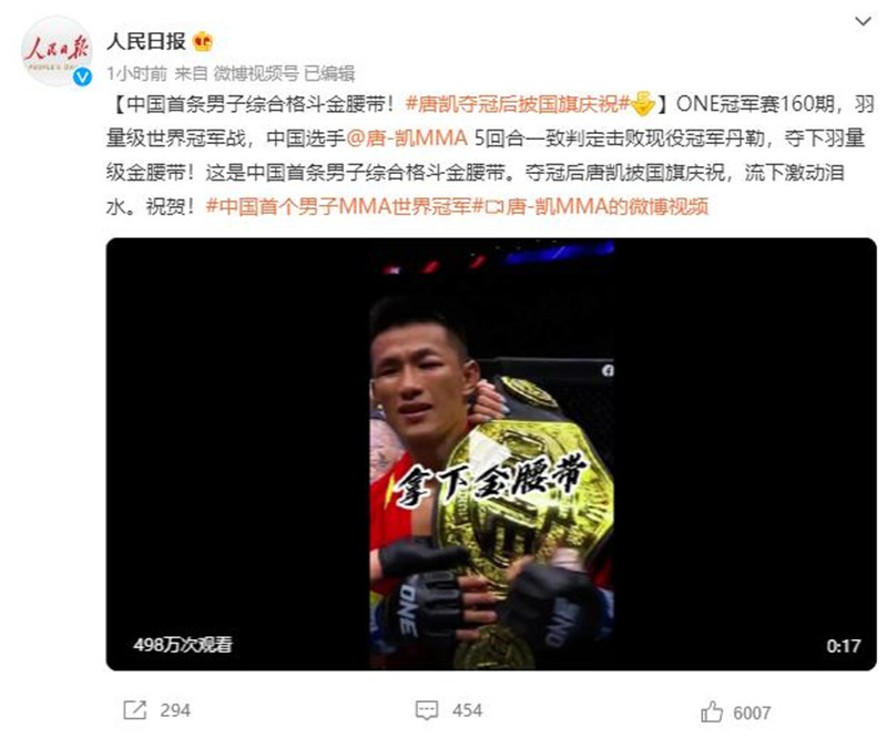 在當(dāng)?shù)?月26日的比賽中,唐凱憑借前幾回合擊倒對(duì)手以及給丹勒造成的腿部重創(chuàng)奪得羽量級(jí)世界冠軍!