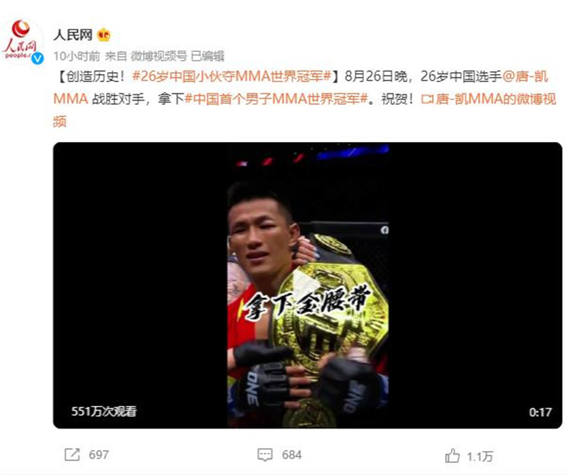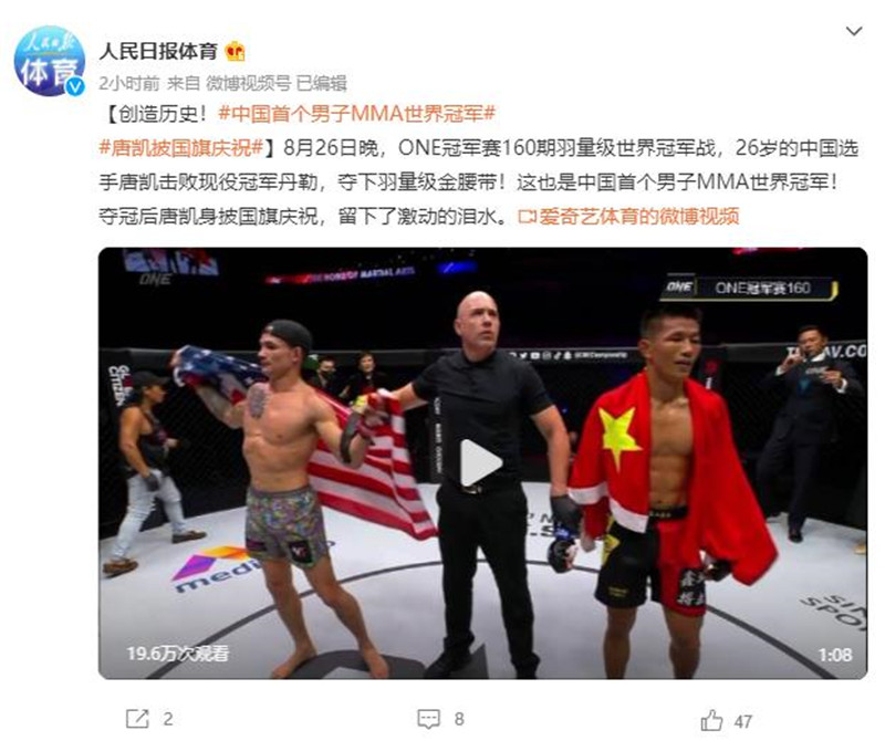 2022年8月26日,鑫江戰(zhàn)將唐凱在ONE羽量級(jí)世界冠軍斬獲金腰帶,為祖國(guó)再次爭(zhēng)光!